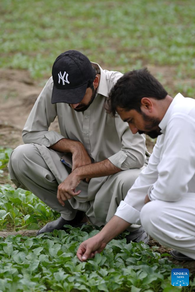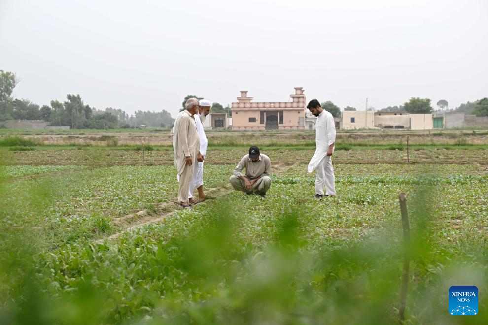 Farmers check on a Chinese cauliflower field in Attock district of Pakistan's eastern Punjab province on Aug. 13, 2025. In recent years, Tianjin's cauliflower seed exports to Pakistan have accounted for over 70 percent of Pakistan's annual planting, helping to address bottlenecks in the local cauliflower industry.(Photo by Daniyal Khan Jadoon/Xinhua)