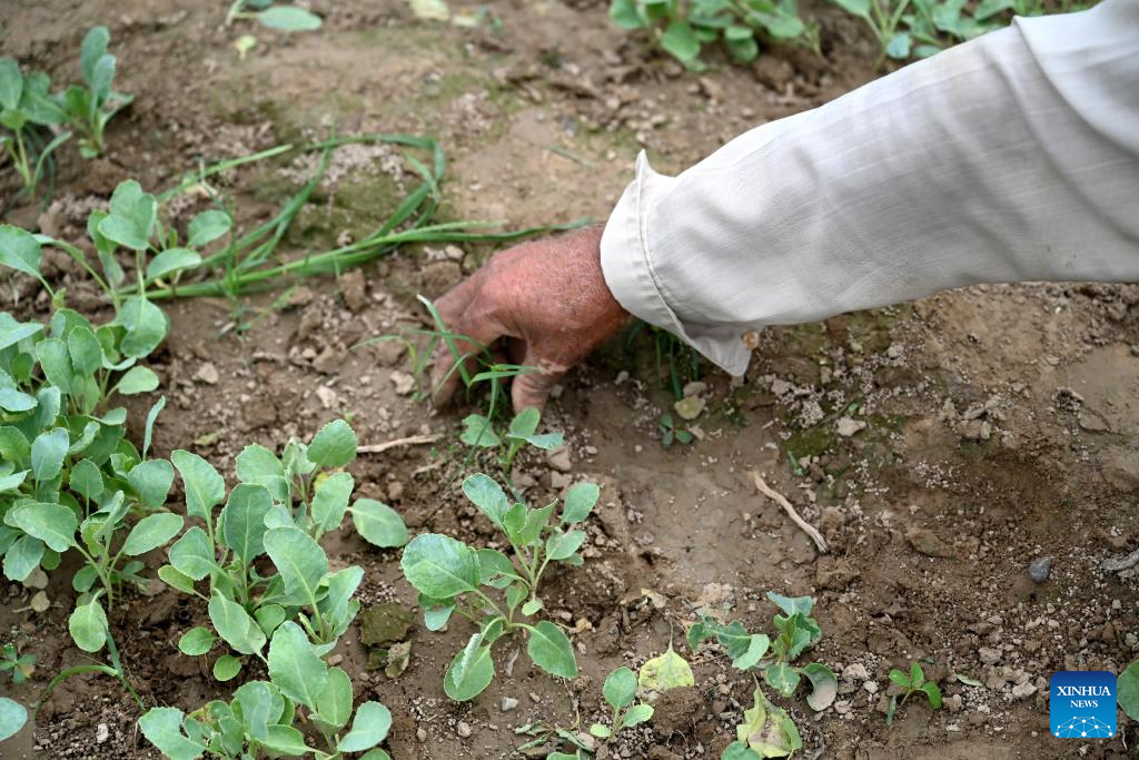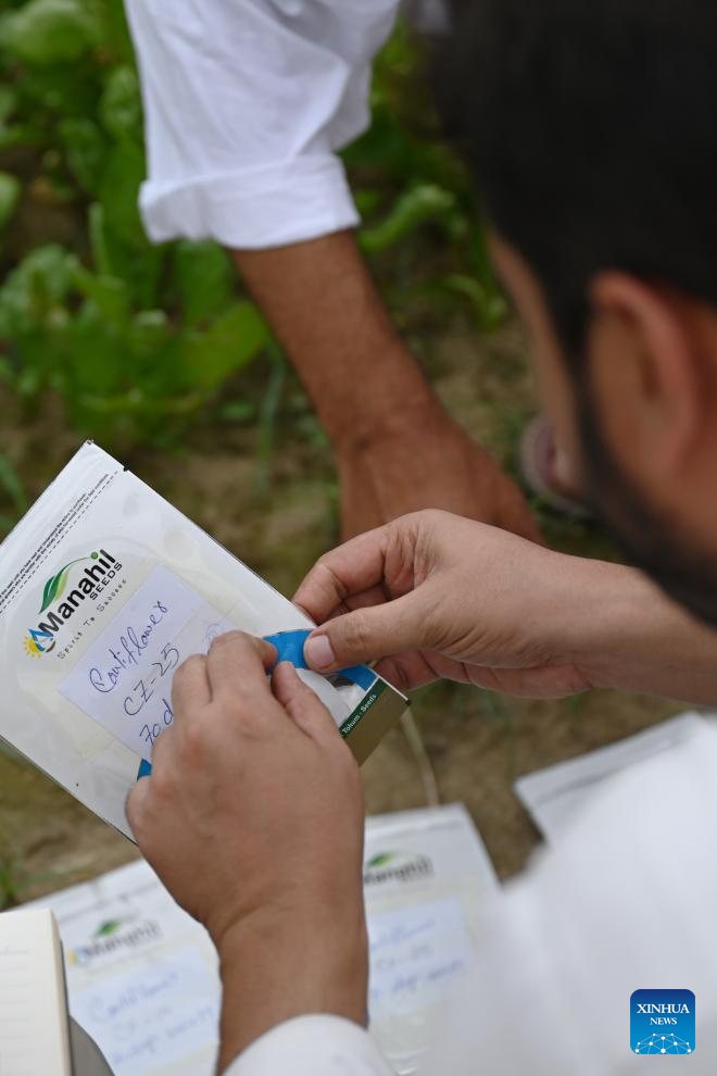 A farmer checks on Chinese cauliflower seeds in Attock district of Pakistan's eastern Punjab province on Aug. 13, 2025. In recent years, Tianjin's cauliflower seed exports to Pakistan have accounted for over 70 percent of Pakistan's annual planting, helping to address bottlenecks in the local cauliflower industry. (Photo by Daniyal Khan Jadoon/Xinhua)