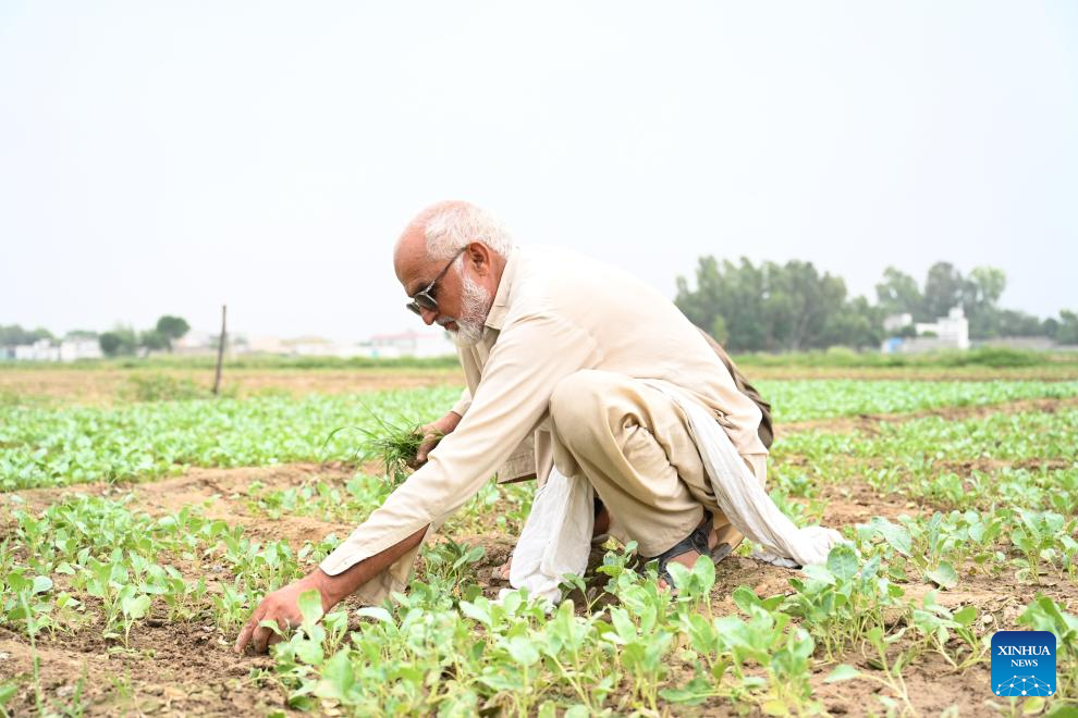 A farmer weeds a Chinese cauliflower field in Attock district of Pakistan's eastern Punjab province on Aug. 13, 2025. In recent years, Tianjin's cauliflower seed exports to Pakistan have accounted for over 70 percent of Pakistan's annual planting, helping to address bottlenecks in the local cauliflower industry.(Photo by Daniyal Khan Jadoon/Xinhua)