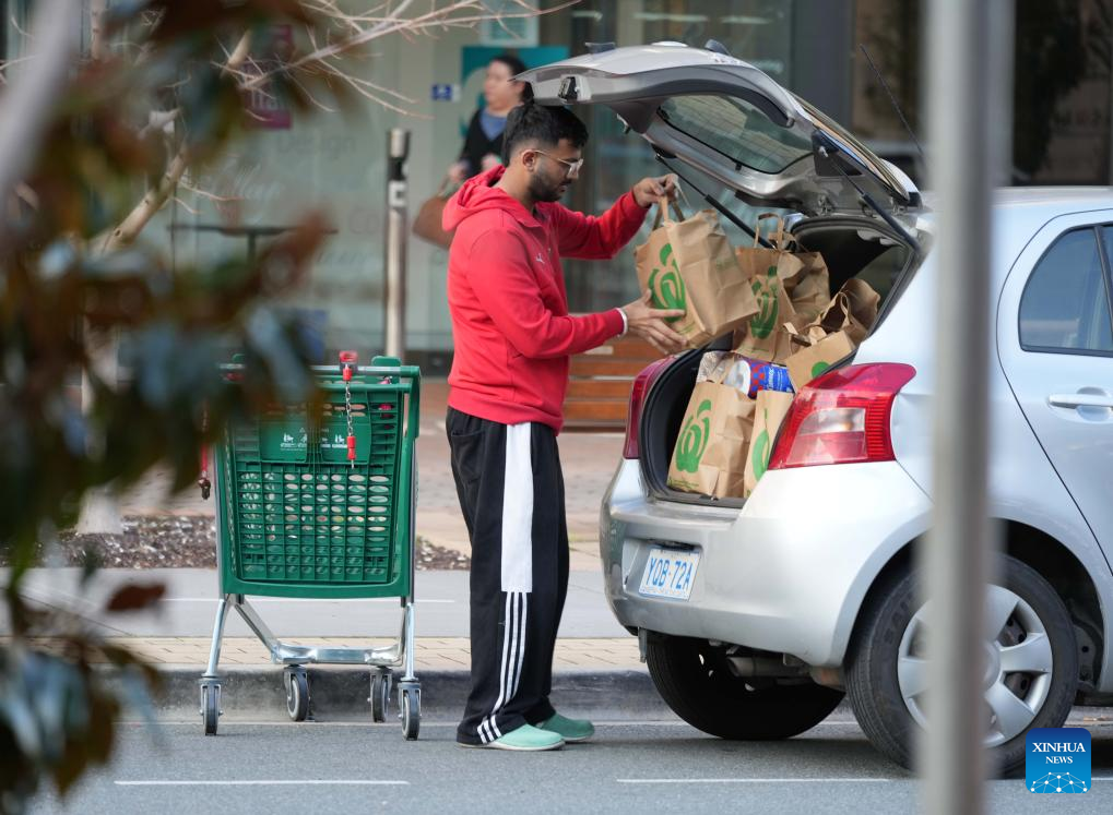 A customer arranges groceries after shopping at a shopping center in Canberra, Australia, Sept. 3, 2025. Australia's rate of economic growth accelerated to 0.6 percent in the second quarter of 2025, according to official figures released on Wednesday. (Photo by Zhang Na/Xinhua)