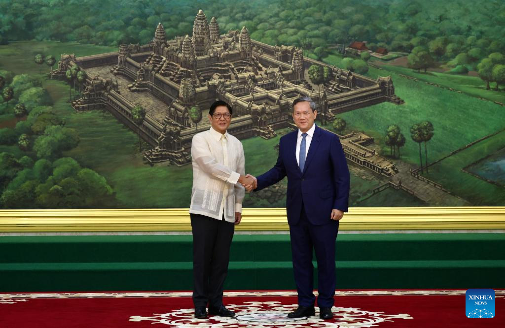 Cambodian Prime Minister Hun Manet (R) shakes hands with visiting Philippine President Ferdinand Romualdez Marcos in Phnom Penh, Cambodia on Sept. 8, 2025. Cambodia and the Philippines on Monday signed three documents, promoting bilateral cooperation in air connectivity, higher education, and combating cross-border crime. (Agence Kampuchea Press/Handout via Xinhua)