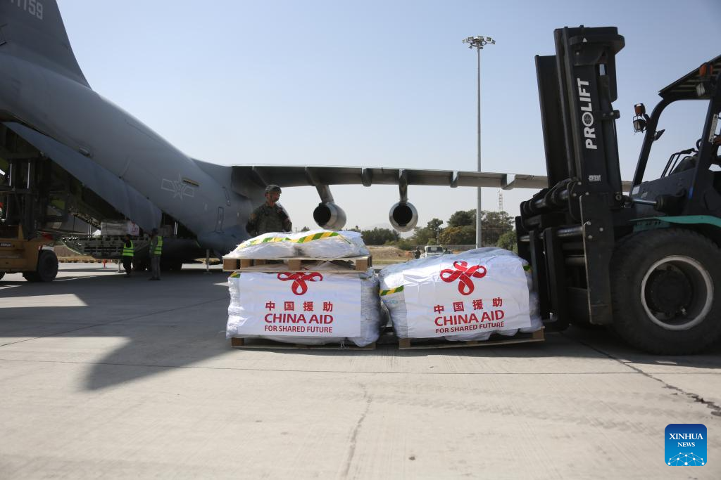 Emergency earthquake relief supplies provided by the Chinese government to Afghanistan are unloaded onto the tarmac at the Kabul Airport, in Kabul, Afghanistan, Sept. 7, 2025. (Photo by Saifurahman Safi/Xinhua)