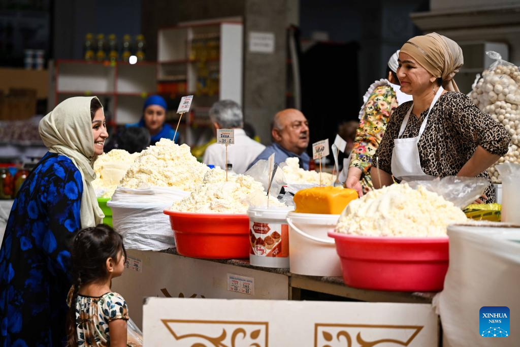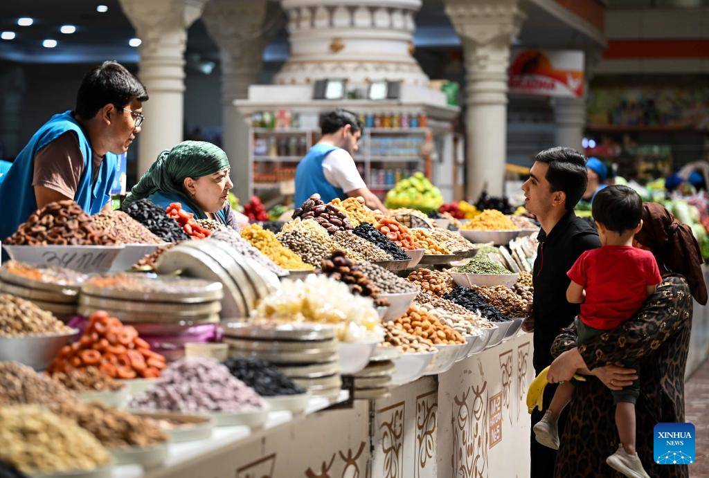 A vendor talks with customers at the Mehrgon Market in Dushanbe, Tajikistan, on Sept. 8, 2025. The Mehrgon Market stands as a captivating shopping attraction in Dushanbe, featuring distinctive architecture and a wonderful assortment of goods. (Xinhua/Li Renzi)