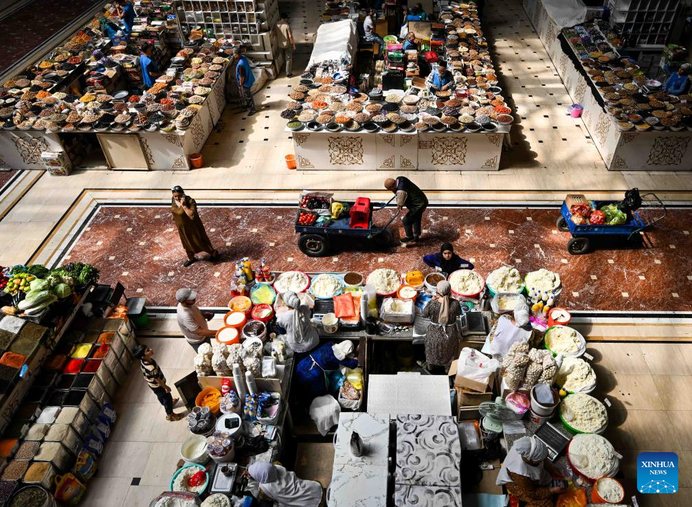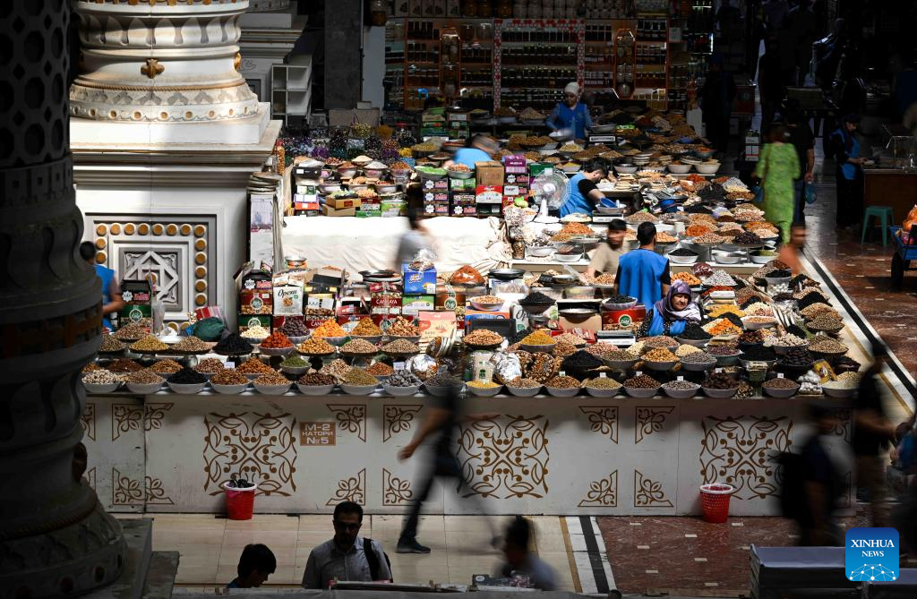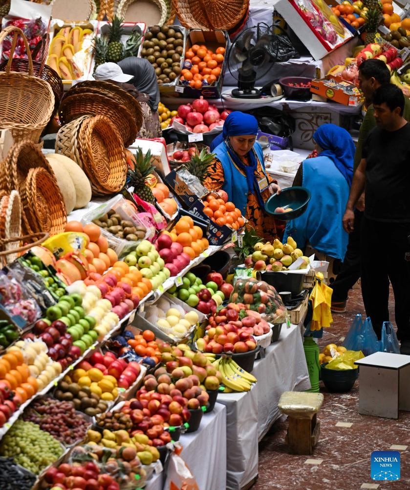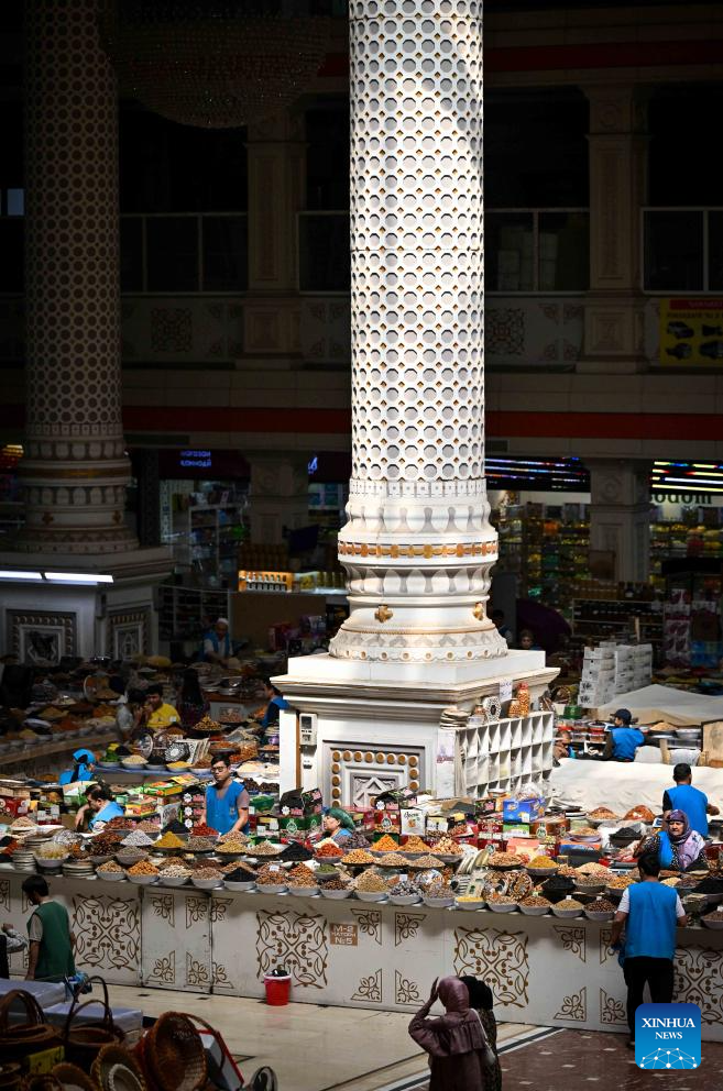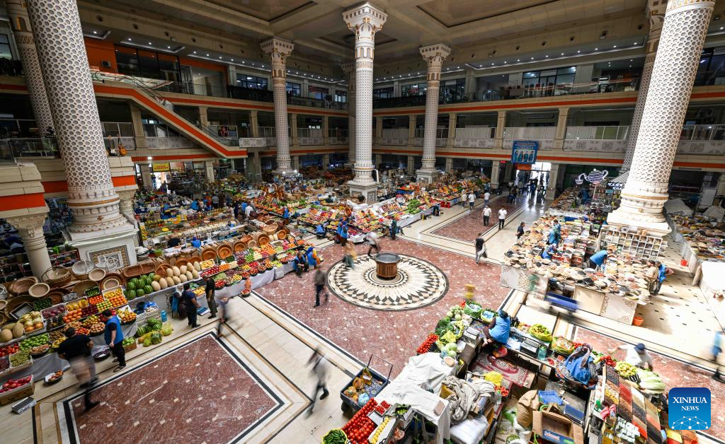 This photo taken on Sept. 8, 2025 shows an interior view of the grand bazaar in Dushanbe, Tajikistan. The Mehrgon Market stands as a captivating shopping attraction in Dushanbe, featuring distinctive architecture and a wonderful assortment of goods. (Xinhua/Li Renzi)