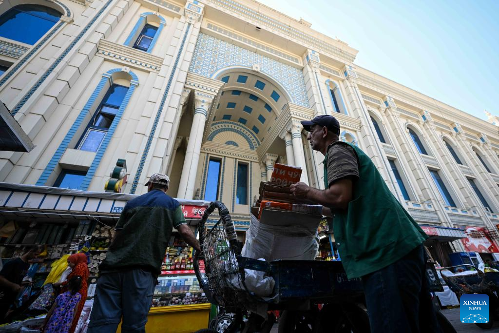 Porters work outside the Mehrgon Market in Dushanbe, Tajikistan, on Sept. 8, 2025. The Mehrgon Market stands as a captivating shopping attraction in Dushanbe, featuring distinctive architecture and a wonderful assortment of goods. (Xinhua/Li Renzi)