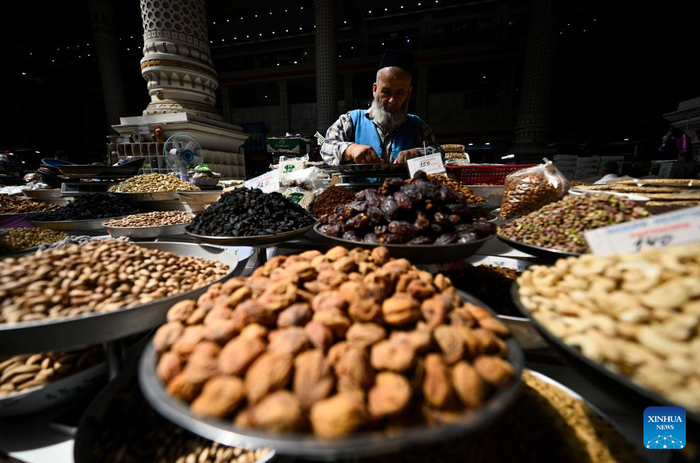 A vendor works at the Mehrgon Market in Dushanbe, Tajikistan, on Sept. 8, 2025. The Mehrgon Market stands as a captivating shopping attraction in Dushanbe, featuring distinctive architecture and a wonderful assortment of goods. (Xinhua/Li Renzi)