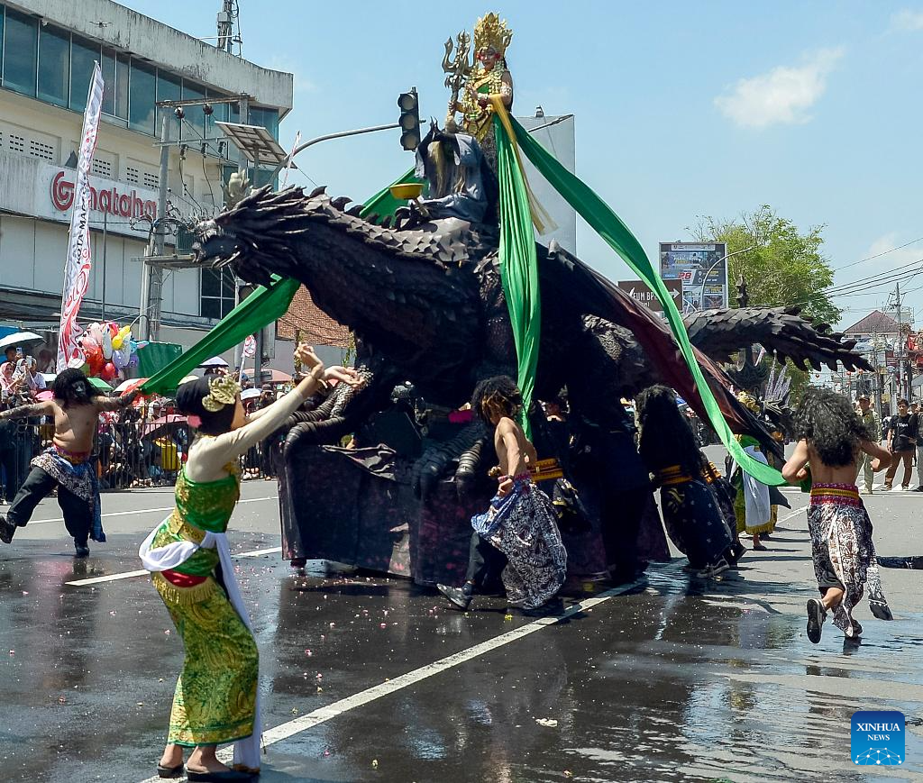 Performers move giant effigies locally known as 'Ogoh-ogoh' while attending Magelang Etno Carnival in Magelang, Central Java, Indonesia, on Sept. 20, 2025. (Photo by Agung Supriyanto/Xinhua)