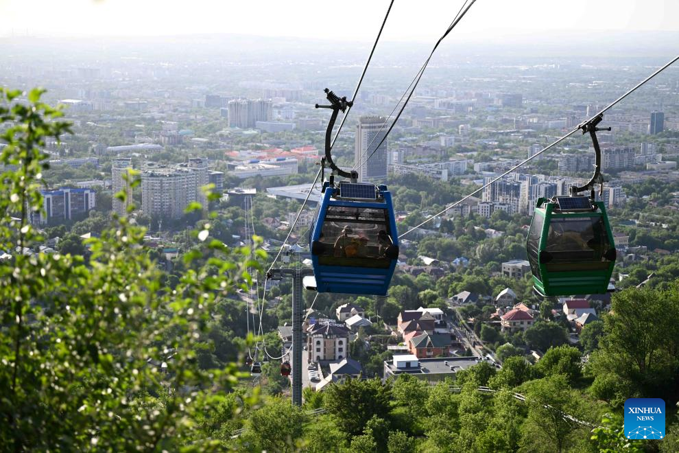 Tourists ride cable cars at the Kok Tobe Mountain in Almaty, Kazakhstan on May 13, 2025. (Xinhua/Li Renzi)