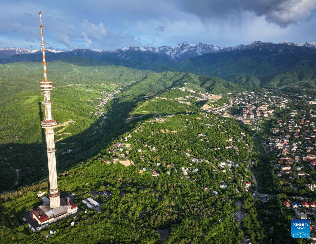 An aerial drone photo taken on May 13, 2025 shows the Kok Tobe Mountain and Kok Tobe TV Tower in Almaty, Kazakhstan. (Xinhua/Li Renzi)