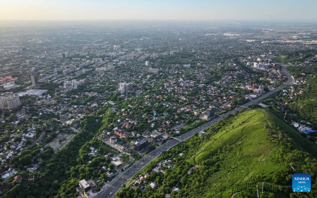 An aerial drone photo taken on May 13, 2025 shows a city view in Almaty, Kazakhstan. (Xinhua/Li Renzi)