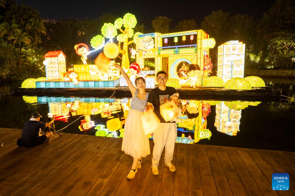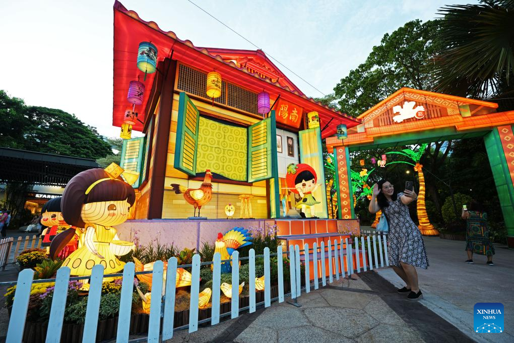 A tourist takes photos of the lantern decorations of a Mid-Autumn Festival lantern show held at Singapore's Gardens by the Bay on Sept. 22, 2025. (Photo by Then Chih Wey/Xinhua)