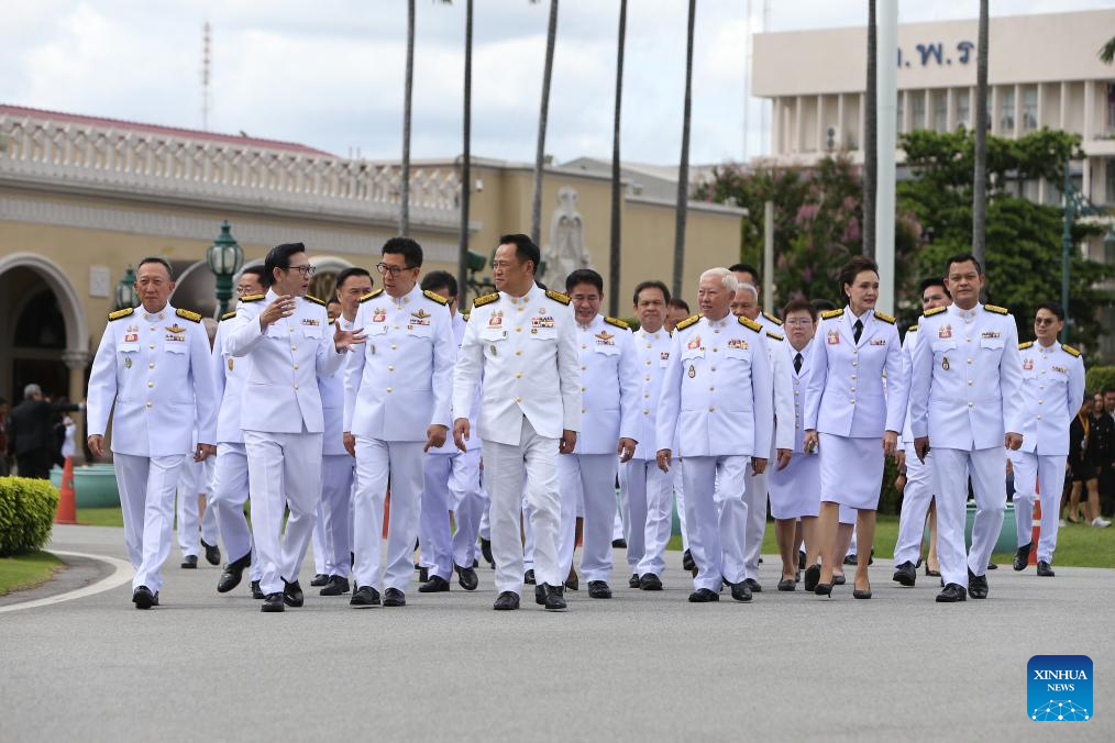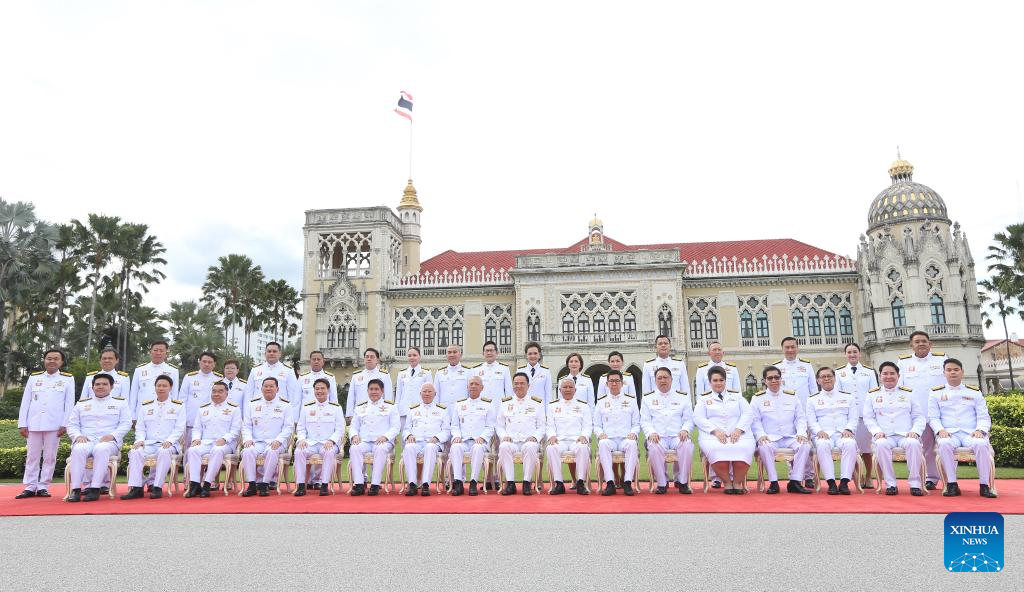 The 36-member cabinet under the Bhumjaithai Party-led coalition recited the oath of allegiance before an audience with King Maha Vajiralongkorn in a traditional ceremony held at Dusit Palace in the capital, Bangkok. (Xinhua/Rachen Sageamsak)