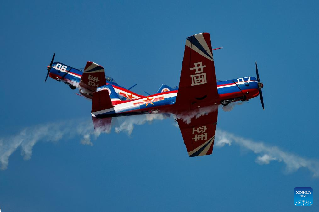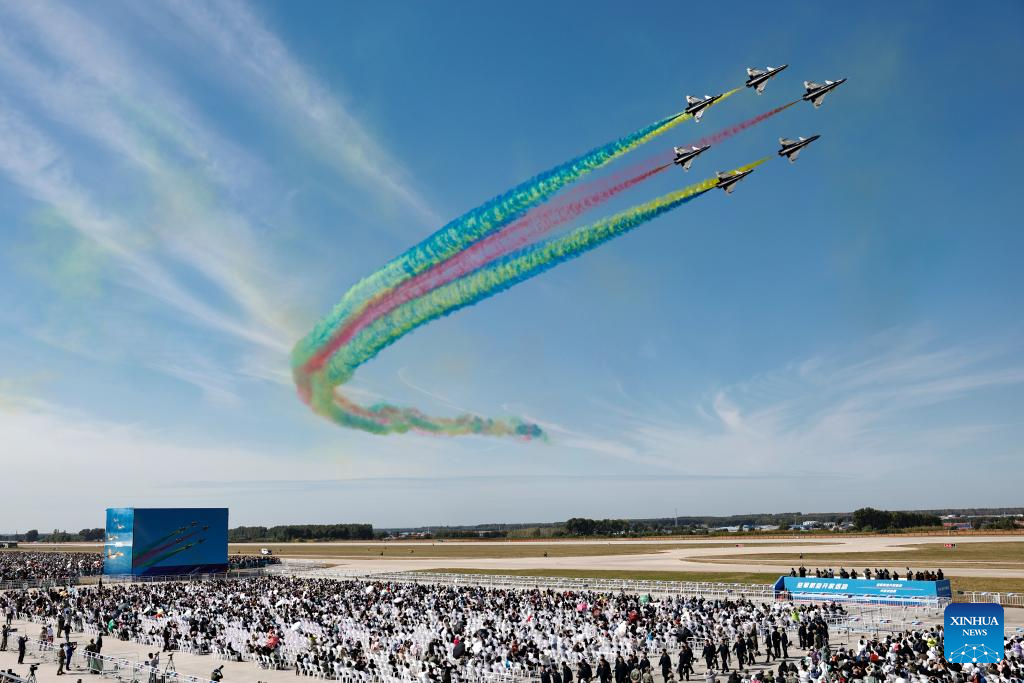 Aircraft of the Bayi Aerobatic Team of the Chinese People's Liberation Army Air Force perform during the 2025 aviation open-day activities of the Chinese People's Liberation Army Air Force and Changchun Air Show in Changchun, northeast China's Jilin Province, Sept. 23, 2025. The events concluded here on Tuesday. (Photo by Tan Sicheng/Xinhua)