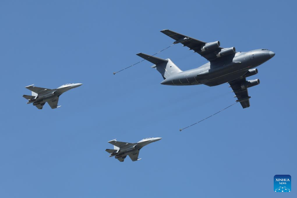 A YY-20A tanker aircraft and two J-16 fighter jets are pictured during the 2025 aviation open-day activities of the Chinese People's Liberation Army Air Force and Changchun Air Show in Changchun, northeast China's Jilin Province, Sept. 23, 2025. The events concluded here on Tuesday. (Photo by Tan Sicheng/Xinhua)