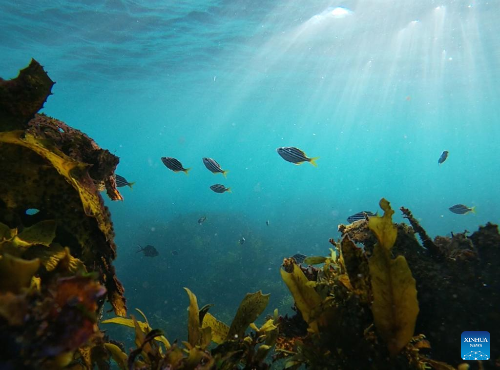 This photo taken on Sept. 25, 2025 shows a school of Australian Mado in a temperate kelp forest in Narooma, Australia. (Photo by Chloe Hayes /Handout via Xinhua)