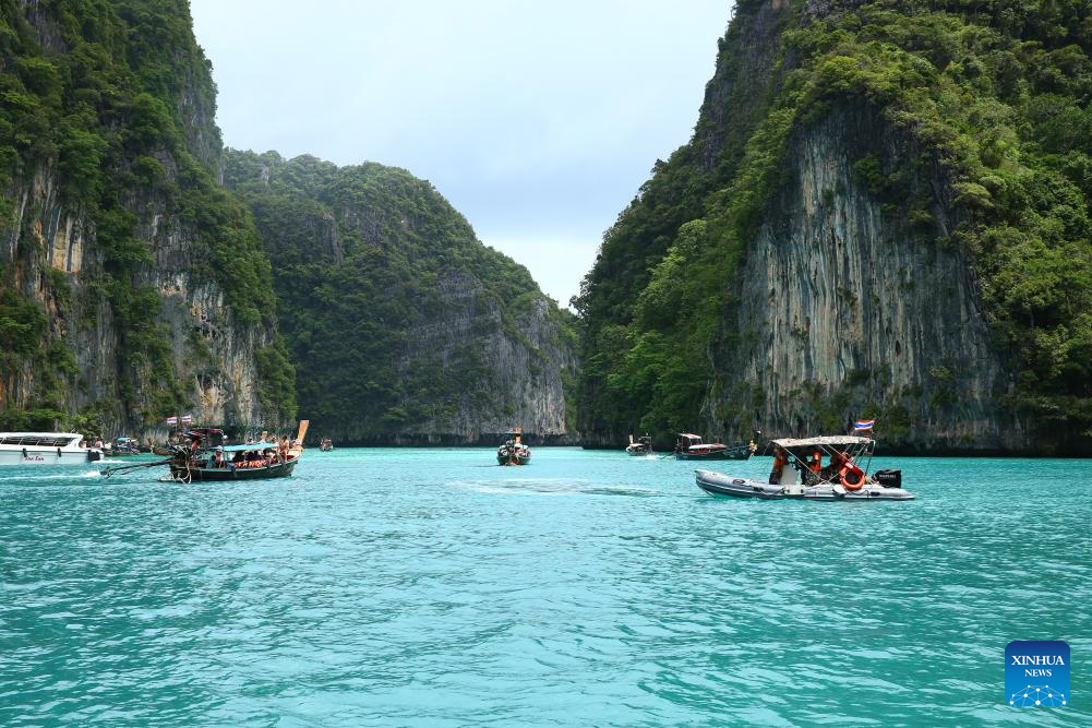 Tourists take boats for sightseeing at Phi Phi islands in Krabi, Thailand, Sept. 25, 2025. Phi Phi Islands, located in the central area of the Andaman Sea, are known for their clear sea water and cliff sights. (Xinhua/Sun Weitong)