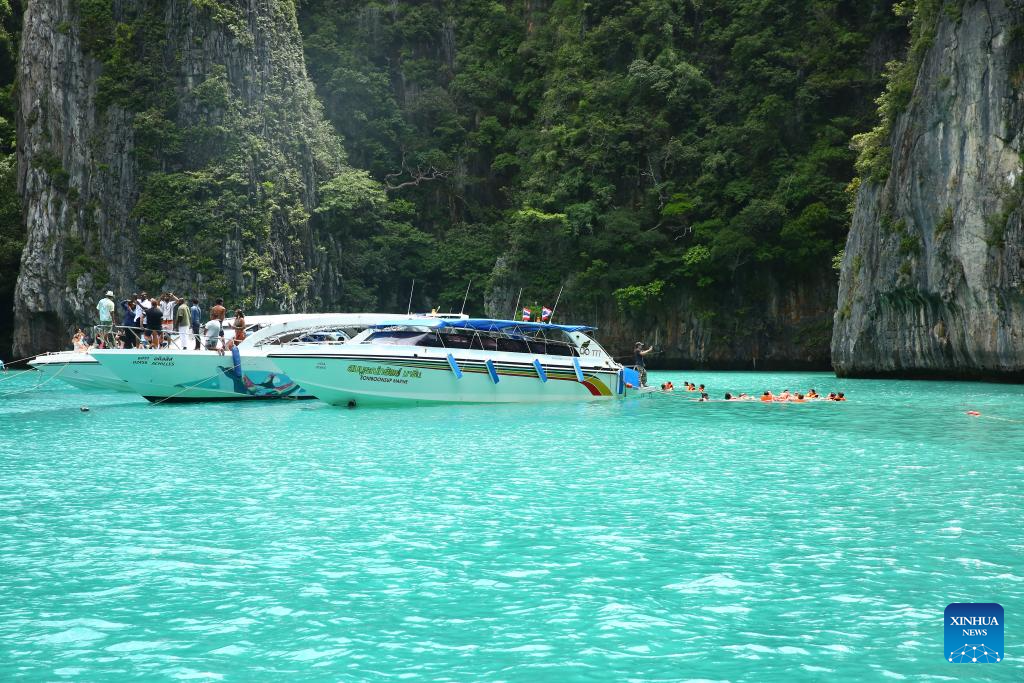 Tourists enjoy themselves at Phi Phi islands in Krabi, Thailand, Sept. 25, 2025. Phi Phi Islands, located in the central area of the Andaman Sea, are known for their clear sea water and cliff sights. (Xinhua/Sun Weitong)