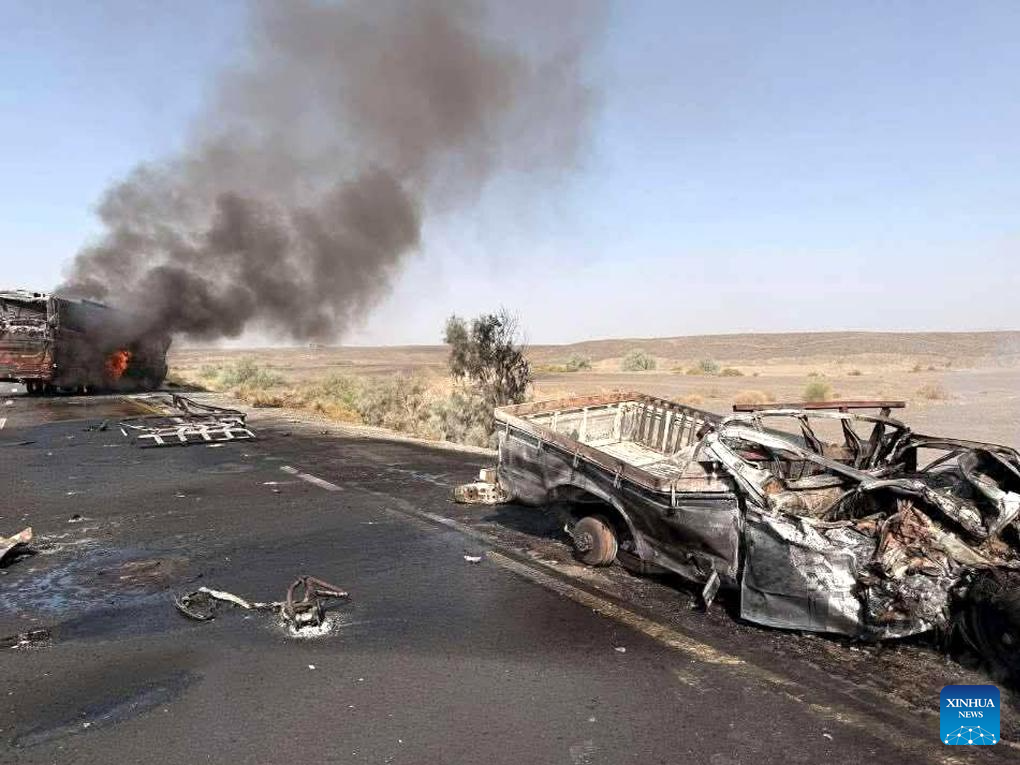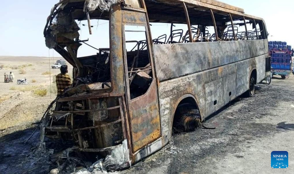 This photo taken with a mobile phone shows a burnt passenger bus at the road accident site in Panjgur district of Pakistan's southwest Balochistan province on Sept. 27, 2025. At least eight people were killed and three others injured in a road accident in Panjgur district of Pakistan's southwest Balochistan province on Saturday, a rescue official told Xinhua. (Str/Xinhua)