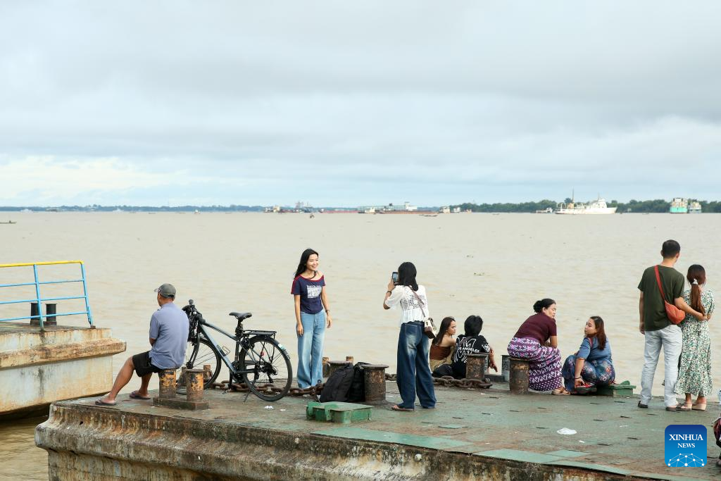 People enjoy sunset near a jetty along the Yangon River in Yangon, Myanmar, Sept. 27, 2025. (Xinhua/Myo Kyaw Soe)