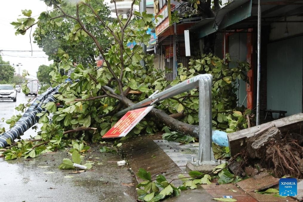 A tree and a utility pole are toppled in Ninh Binh Province, Vietnam, Sept. 29, 2025. The death toll from Typhoon Bualoi in Vietnam has risen to 11, with 13 people still missing and 33 others injured, local daily newspaper Nhan Dan (People) reported Monday. (VNA/Handout via Xinhua)