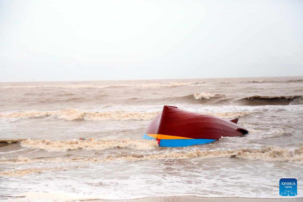 A sunken fishing boat is seen in Quang Tri Province, Vietnam, Sept. 29, 2025. The death toll from Typhoon Bualoi in Vietnam has risen to 11, with 13 people still missing and 33 others injured, local daily newspaper Nhan Dan (People) reported Monday. (VNA/Handout via Xinhua)