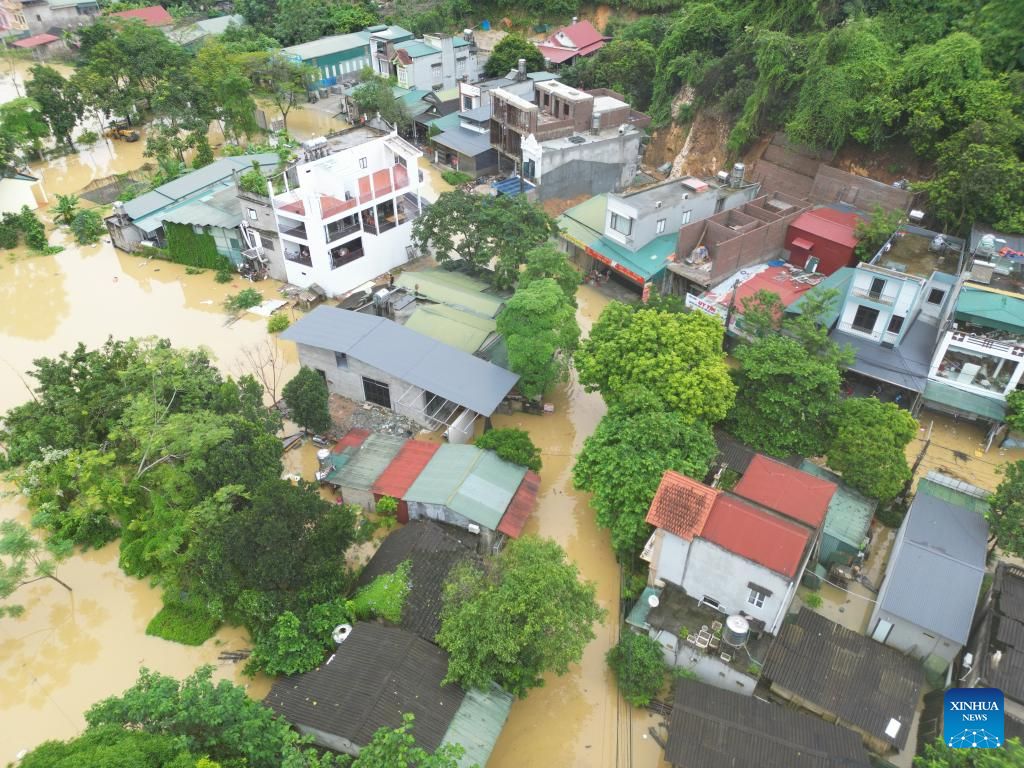 A drone photo taken on Sept. 30, 2025 shows houses partially submerged in flood water in Lao Cai Province, Vietnam. The death toll from Typhoon Bualoi and subsequent floods and landslides in Vietnam has risen to 27, with 21 people still missing and 112 others injured across 17 northern and central provinces, Vietnam News Agency reported Tuesday. (VNA via Xinhua)