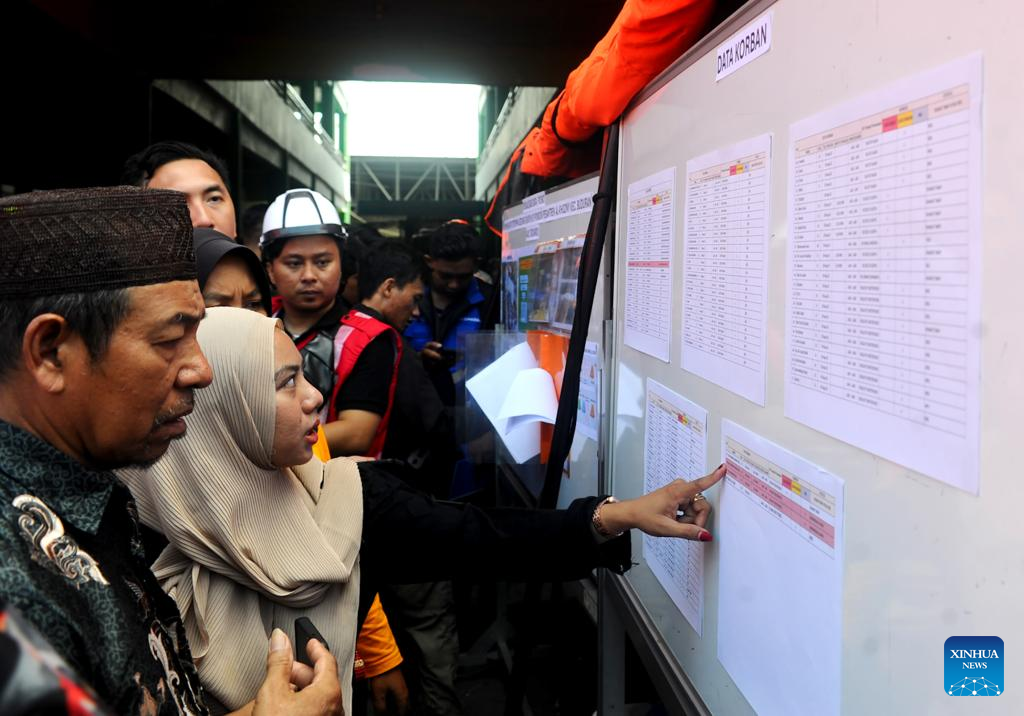 People check name lists of victims after a school building collapse at Al Khoziny Islamic Boarding School in Sidoarjo district, East Java, Indonesia, Oct. 1, 2025. Indonesia's disaster management agency said Wednesday that at least 91 were trapped after a school building collapsed on Monday in the Sidoarjo district of East Java province. (Photo by Sahlan Kurniawan/Xinhua)