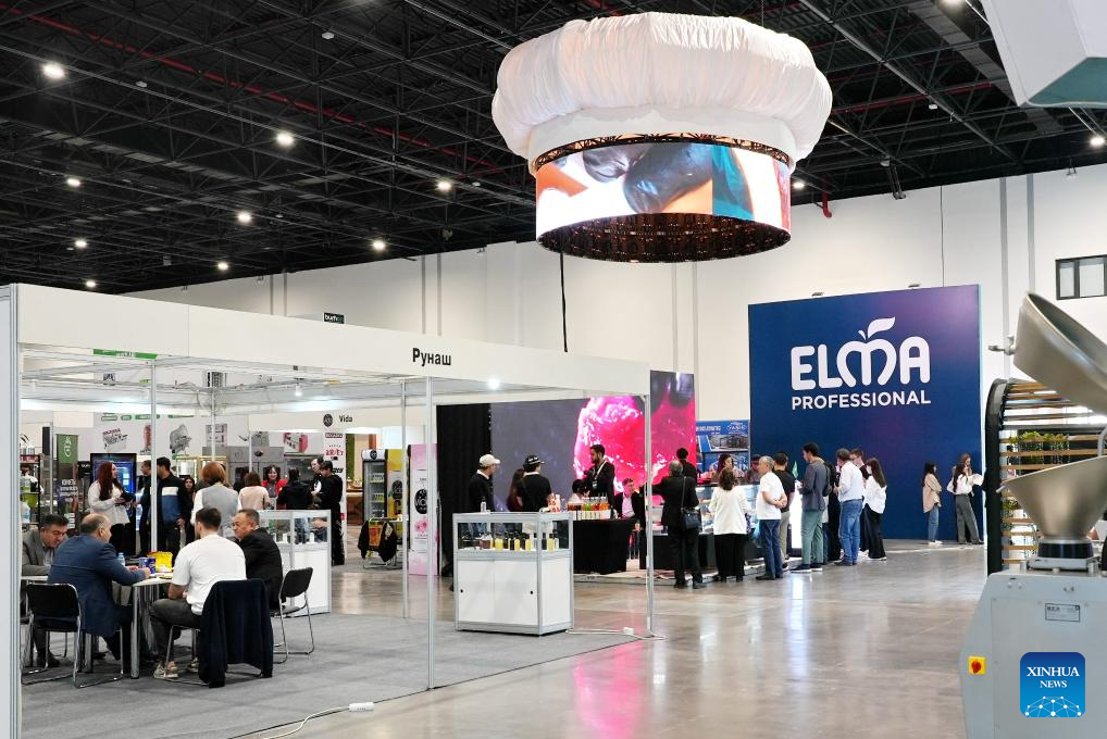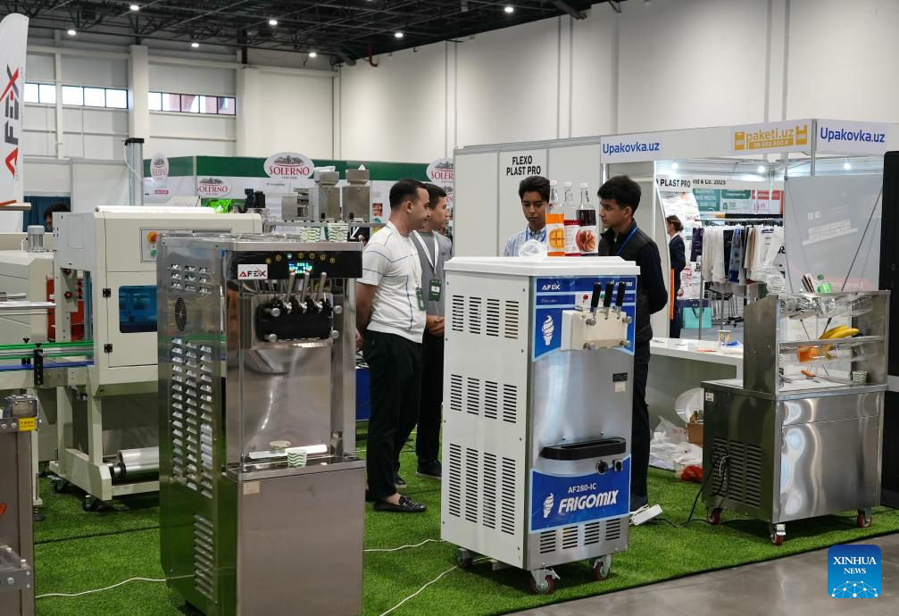 This photo taken on Oct. 4, 2025 shows a scene at an international exhibition of food, packaging, processing technologies and HoReCa (hotel, restaurant and cafe) industry in Tashkent, the capital of Uzbekistan. The exhibition, held here on Oct. 2-4, brought together companies from various sectors, including food, ingredients and spices, packaging equipment, hygiene and safety, and storage and logistics, aiming to promote technological exchange within the industry and drive the development of the sector in Uzbekistan. (Photo by Zafar Khalilov/Xinhua)