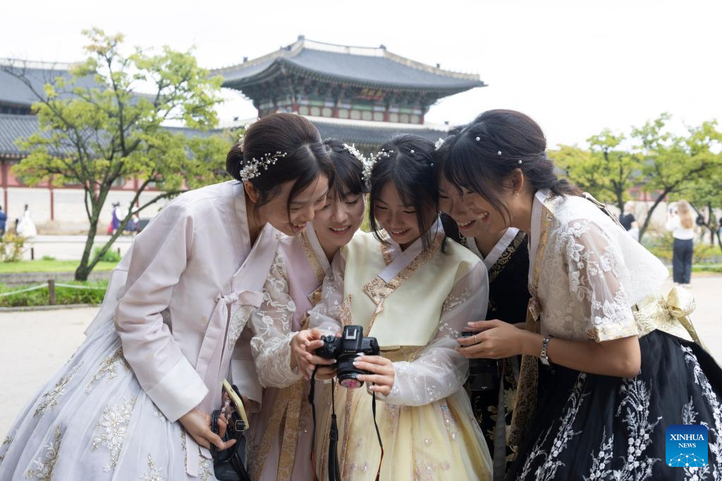 People in traditional Korean attire "Hanbok" review photos at the Gyeongbokgung Palace in Seoul, South Korea, Oct. 5, 2025. Ancient palaces in Seoul including the Gyeongbokgung Palace are open to the public free of charge from Oct. 3 to 9. (Photo by Jun Hyosang/Xinhua)