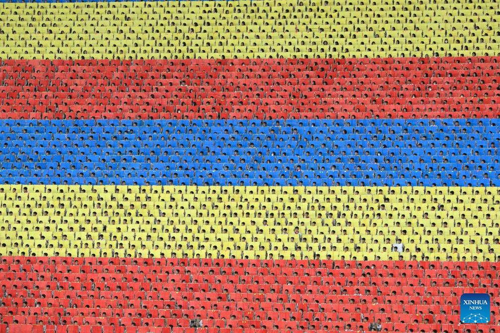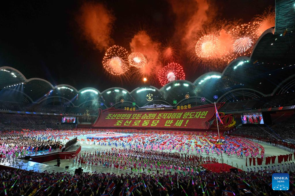 This photo taken on Oct. 9, 2025 shows a scene during an event to celebrate the 80th founding anniversary of the Workers' Party of Korea (WPK), at the May Day Stadium in Pyongyang, the Democratic People's Republic of Korea (DPRK). The DPRK on Thursday held a grand commemorative meeting here to celebrate the 80th founding anniversary of the WPK, the official Korean Central News Agency (KCNA) reported Friday. (Xinhua/Zhai Jianlan)