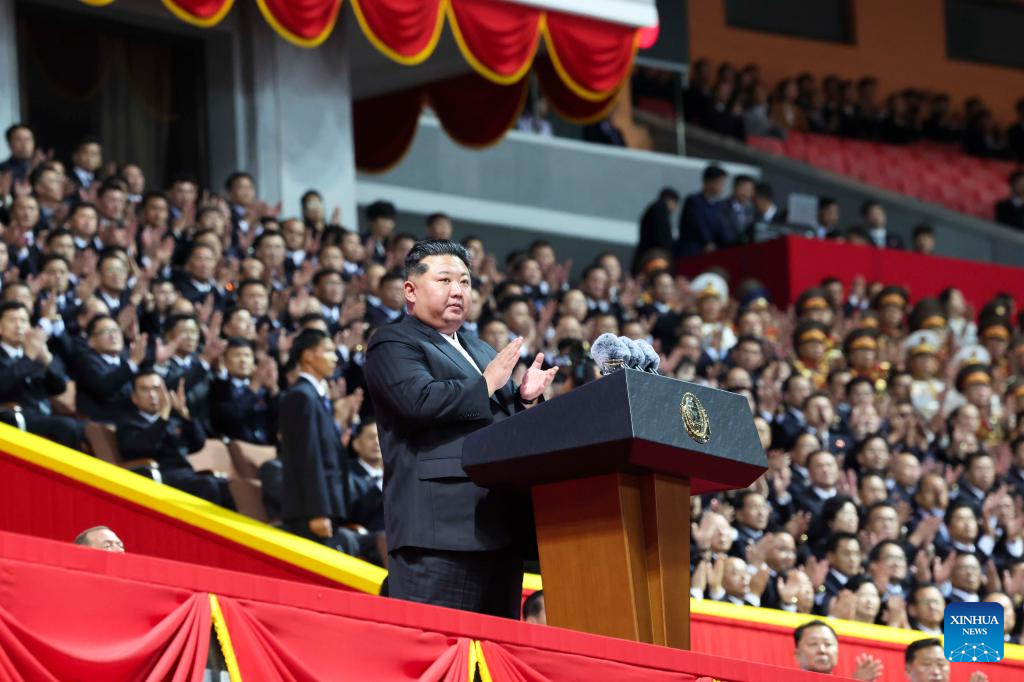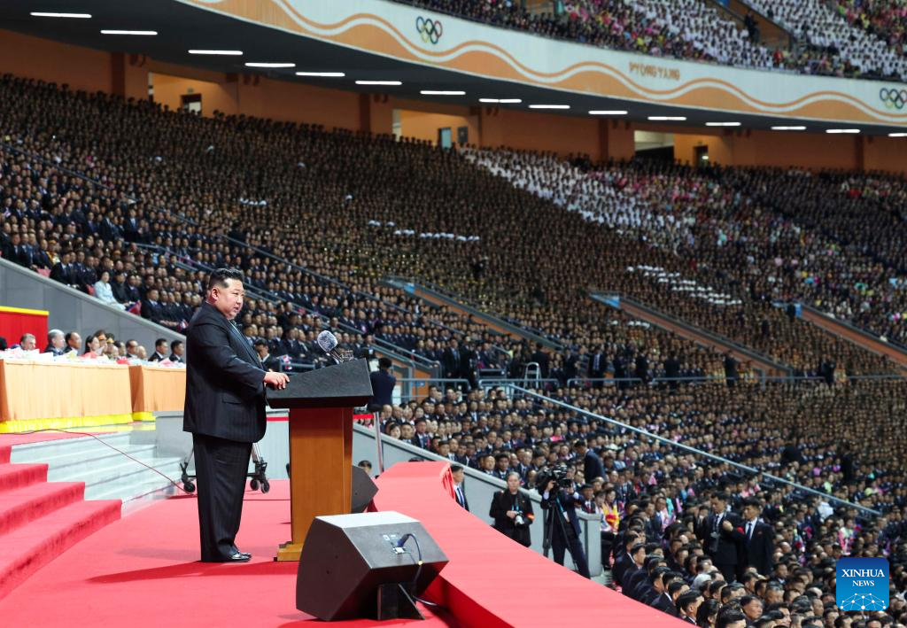 Kim Jong Un, general secretary of the Workers' Party of Korea (WPK) and president of the State Affairs of the Democratic People's Republic of Korea (DPRK), delivers a speech at a grand commemorative meeting to celebrate the 80th founding anniversary of the WPK, at the May Day Stadium in Pyongyang, the DPRK, Oct. 9, 2025. The DPRK on Thursday held a grand commemorative meeting here to celebrate the 80th founding anniversary of the WPK, the official Korean Central News Agency (KCNA) reported Friday. (Xinhua/Huang Jingwen)