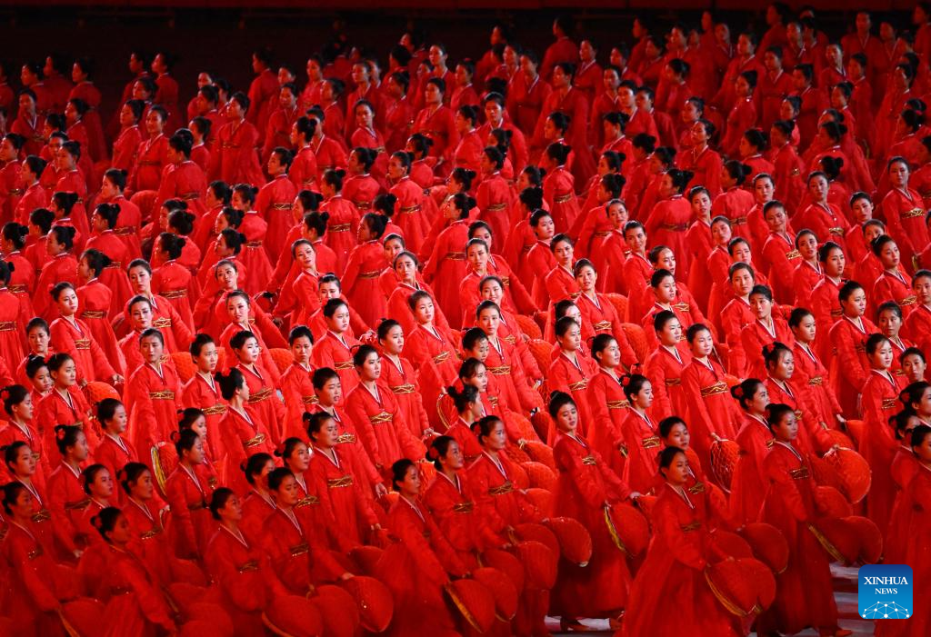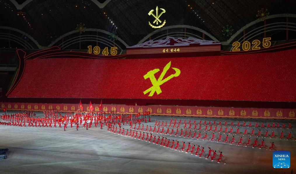 This photo taken on Oct. 9, 2025 shows a scene during an event to celebrate the 80th founding anniversary of the Workers' Party of Korea (WPK), at the May Day Stadium in Pyongyang, the Democratic People's Republic of Korea (DPRK). The DPRK on Thursday held a grand commemorative meeting here to celebrate the 80th founding anniversary of the WPK, the official Korean Central News Agency (KCNA) reported Friday. (Xinhua/Shen Hong)
