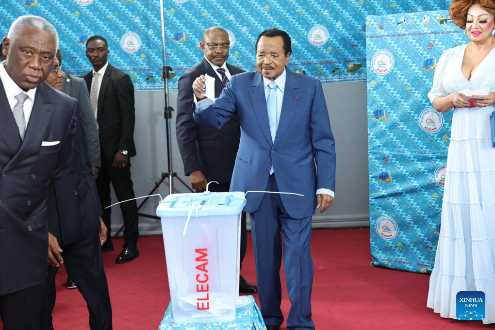 Cameroonian President Paul Biya casts his ballot at a polling station during the presidential election in Yaounde, Cameroon, Oct. 12, 2025. Voting for Cameroon's presidential election started early on Sunday as voters queued up outside polling stations across the country.