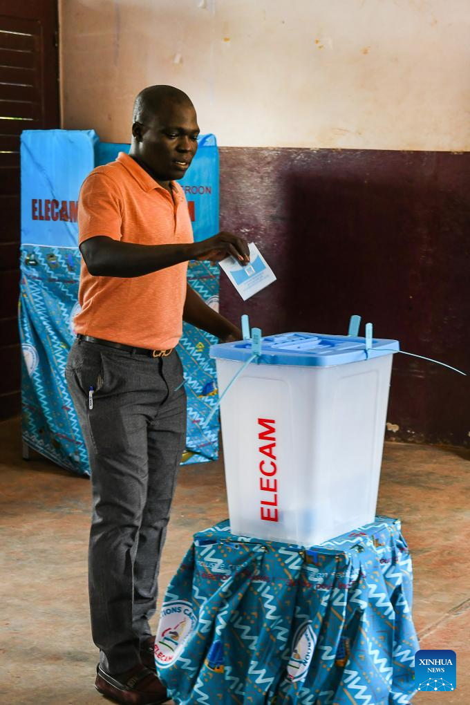 A voter casts his ballot at a polling station during the presidential election in Yaounde, Cameroon, Oct. 12, 2025. Voting for Cameroon's presidential election started early on Sunday as voters queued up outside polling stations across the country.