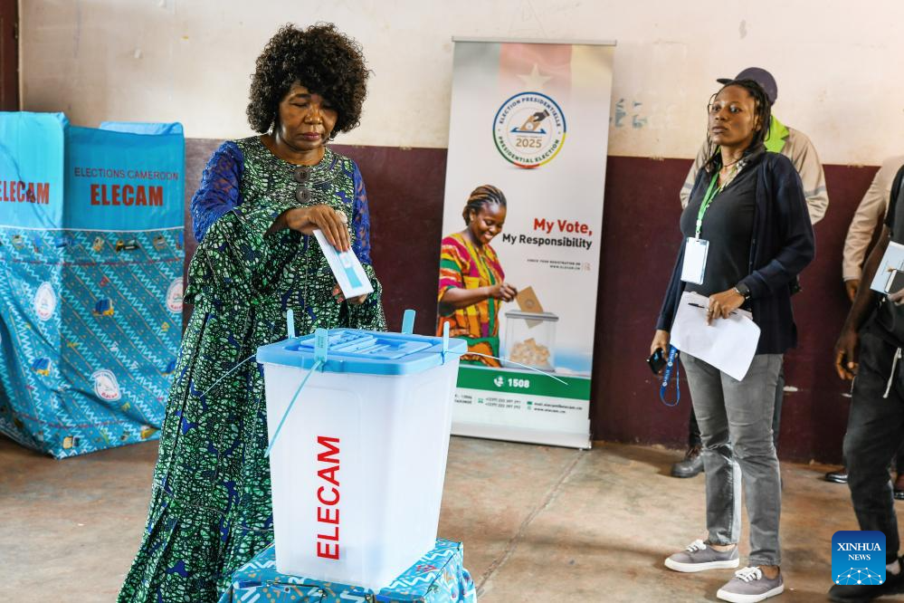 A voter casts her ballot at a polling station during the presidential election in Yaounde, Cameroon, Oct. 12, 2025. Voting for Cameroon's presidential election started early on Sunday as voters queued up outside polling stations across the country.