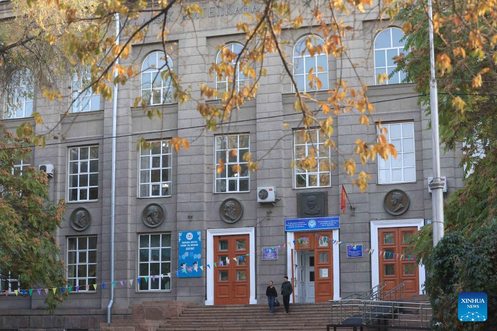 People walk out of a library for children and teenagers in Bishkek, Kyrgyzstan, Oct. 14, 2025. (Photo by Roman Gainanov/Xinhua)