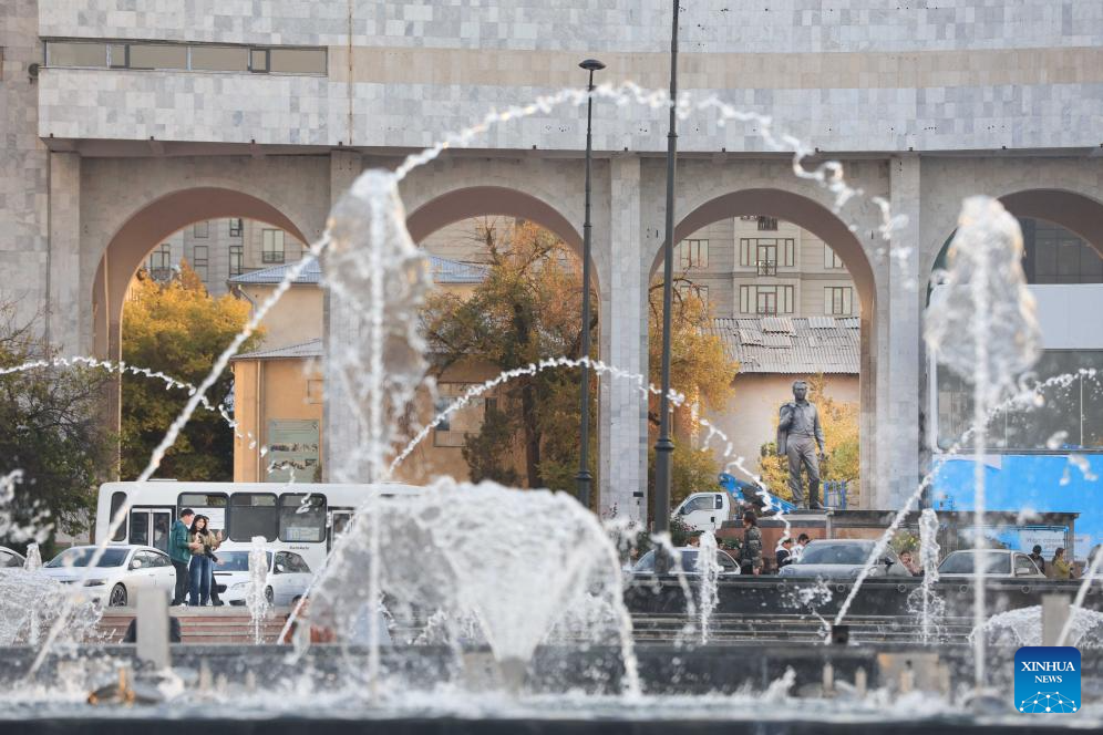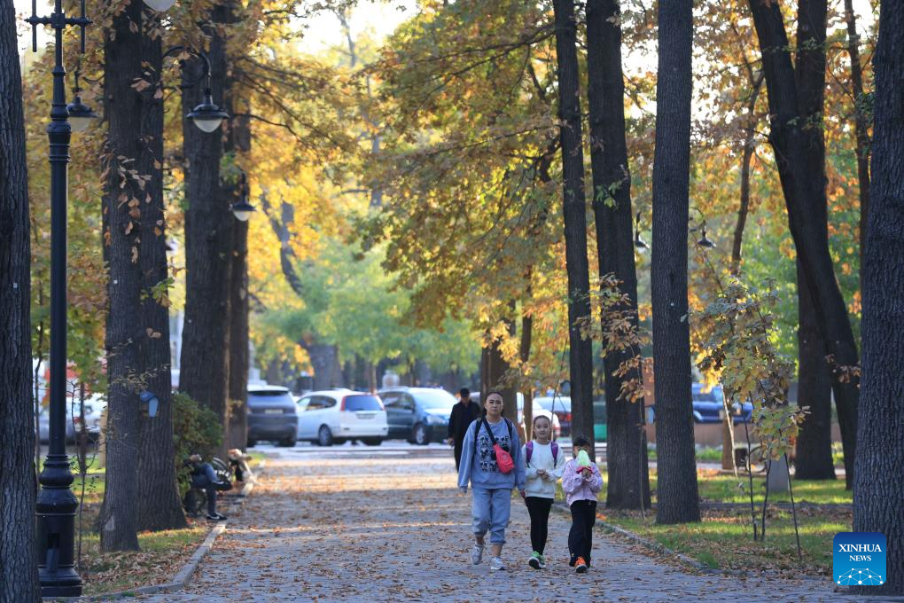 People enjoy their time at downtown of Bishkek, Kyrgyzstan, Oct. 14, 2025. (Photo by Roman Gainanov/Xinhua)