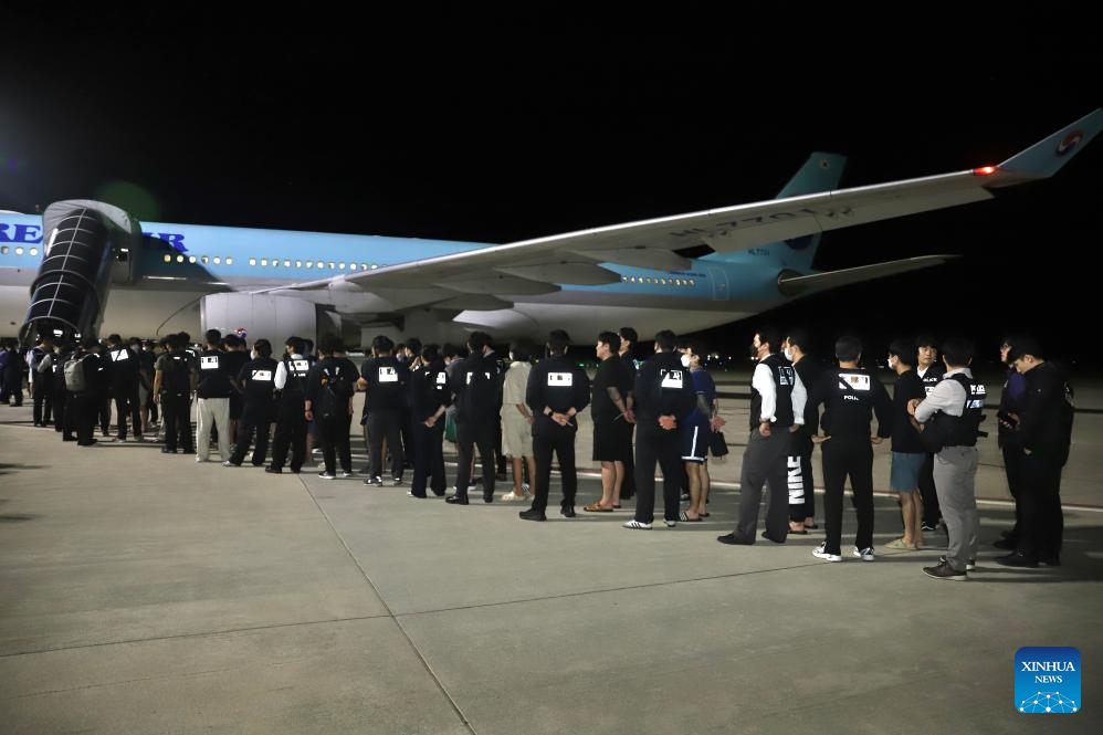 South Korean online scam suspects are escorted onto a plane at the Techo International Airport in Kandal province, Cambodia on Oct. 18, 2025. Cambodia deported 64 South Korean online scam suspects, including five women, to their birth country on Friday night, said a news release from Cambodia's Ad-Hoc Committee to Combat Online Scams on Saturday. (Agence Kampuchea Presse/Handout via Xinhua)