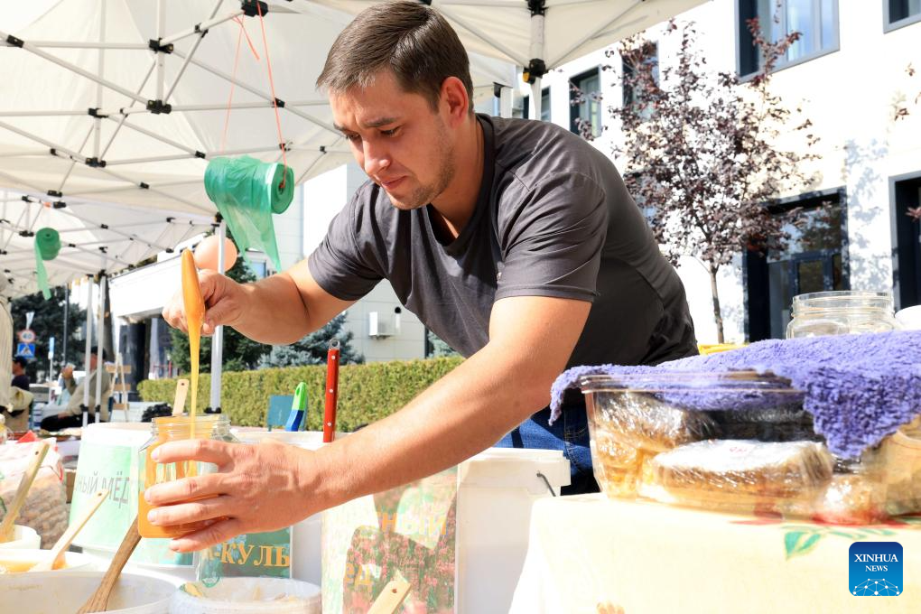 A man puts honey into a container at an agro-industrial exhibition and agricultural fair in Bishkek, Kyrgyzstan, Oct. 17, 2025. A three-day agro-industrial exhibition and agricultural fair opened here on Friday, bringing together exhibitors from various regions of the country. It aims to showcase Kyrgyzstan's agricultural development achievements and strengthen agricultural exchanges and cooperation among regions. (Photo by Roman/Xinhua)
