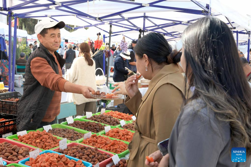 People visit an agro-industrial exhibition and agricultural fair in Bishkek, Kyrgyzstan, Oct. 17, 2025. A three-day agro-industrial exhibition and agricultural fair opened here on Friday, bringing together exhibitors from various regions of the country. It aims to showcase Kyrgyzstan's agricultural development achievements and strengthen agricultural exchanges and cooperation among regions. (Photo by Roman/Xinhua)