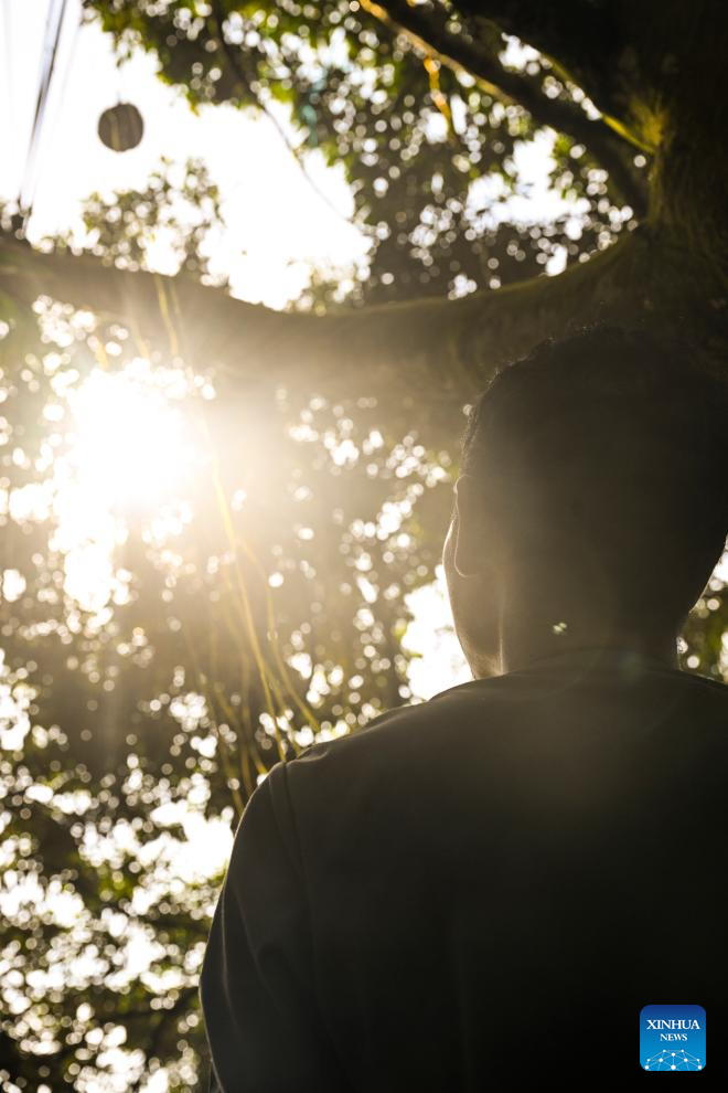 Durians are seen on the tree at a durian orchard in Raub of Pahang state, Malaysia, Oct. 16, 2025. Raub in Pahang state, Malaysia is an important durian-producing region. Due to the unique tropical rainforest climate and soil conditions, premium durian varieties such as Musang King Durian from this area are known for their dense flesh and rich flavor.