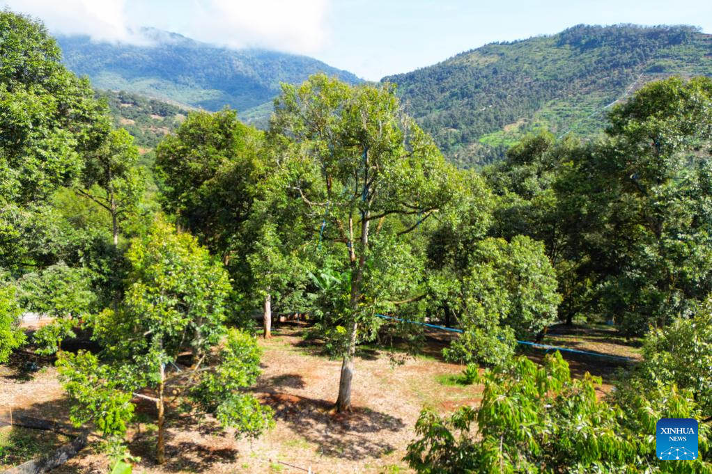A drone photo taken on Oct. 16, 2025 shows a durian orchard in Raub of Pahang state, Malaysia. Raub in Pahang state, Malaysia is an important durian-producing region. Due to the unique tropical rainforest climate and soil conditions, premium durian varieties such as Musang King Durian from this area are known for their dense flesh and rich flavor.