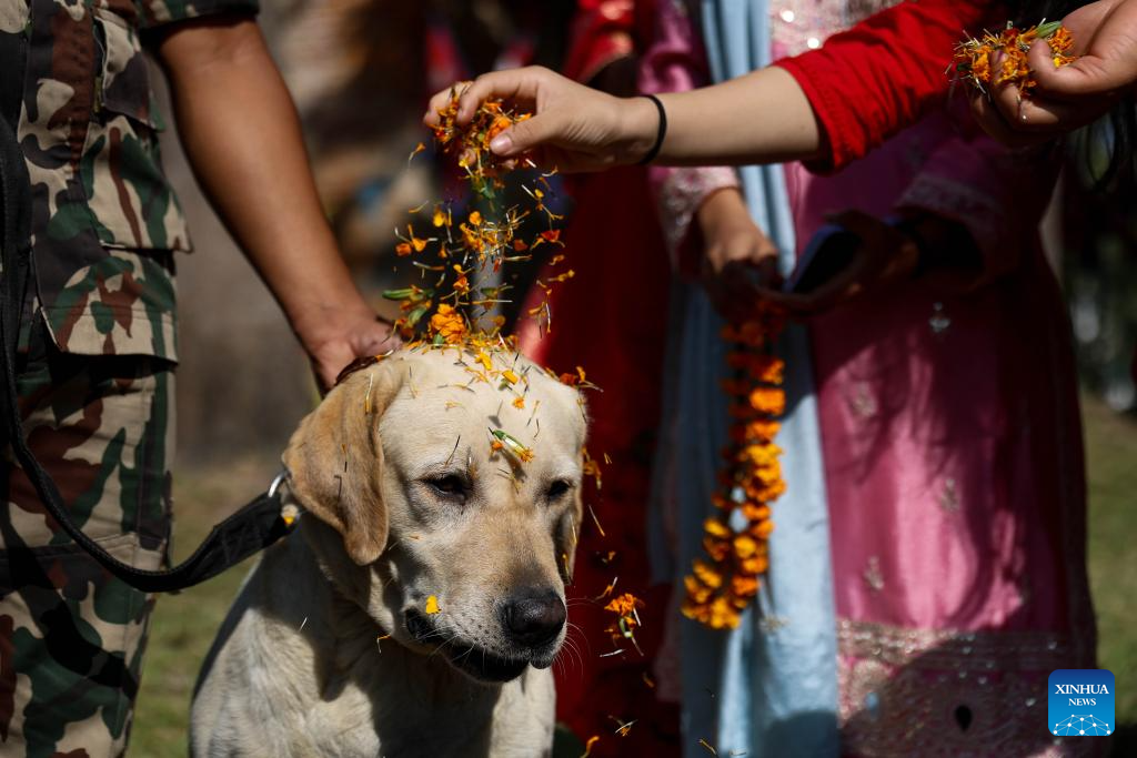 A dog is worshiped during the celebration of the Kukur Tihar festival at an army barracks in Bhaktapur, Nepal, Oct. 20, 2025. The festival is celebrated to honor the loyalty and services of dogs. (Photo by Sulav Shrestha/Xinhua)