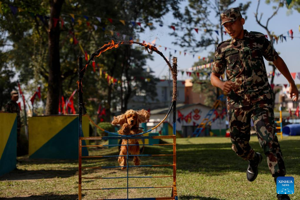 A dog jumps through a fire ring during the celebration of the Kukur Tihar festival at an army barracks in Bhaktapur, Nepal, Oct. 20, 2025. The festival is celebrated to honor the loyalty and services of dogs. (Photo by Sulav Shrestha/Xinhua)