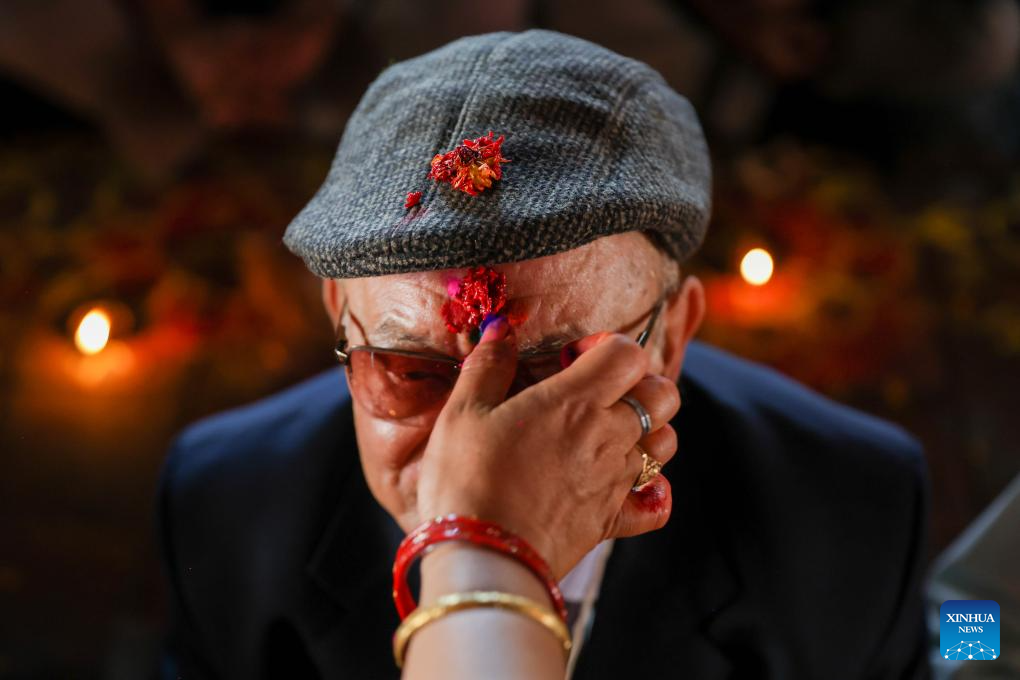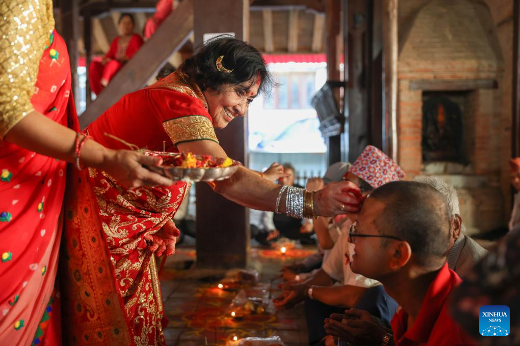 A man receives tika at the mass Bhai Tika ceremony during the Tihar festival at Kasthamandap Temple in Kathmandu, Nepal, Oct. 23, 2025. The last day of Tihar, widely celebrated across Nepal, is known as Bhai Tika. On this day, sisters apply a tika on the foreheads of their brothers praying for their long life, good health and prosperity. (Photo by Sulav Shrestha/Xinhua)
