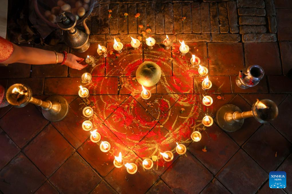 Oil lamps are lit for the mass Bhai Tika ceremony during the Tihar festival at Kasthamandap Temple in Kathmandu, Nepal, Oct. 23, 2025. The last day of Tihar, widely celebrated across Nepal, is known as Bhai Tika. On this day, sisters apply a tika on the foreheads of their brothers praying for their long life, good health and prosperity. (Photo by Sulav Shrestha/Xinhua)