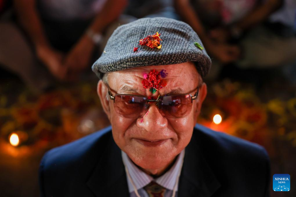 A man with tika is seen at the mass Bhai Tika ceremony during the Tihar festival at Kasthamandap Temple in Kathmandu, Nepal, Oct. 23, 2025. The last day of Tihar, widely celebrated across Nepal, is known as Bhai Tika. On this day, sisters apply a tika on the foreheads of their brothers praying for their long life, good health and prosperity. (Photo by Sulav Shrestha/Xinhua)
