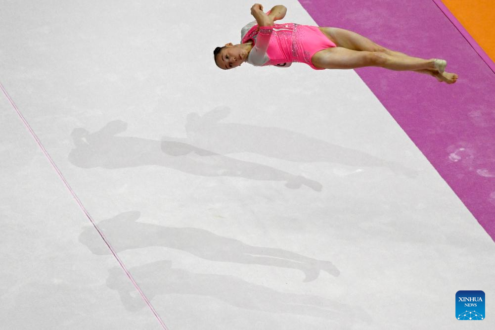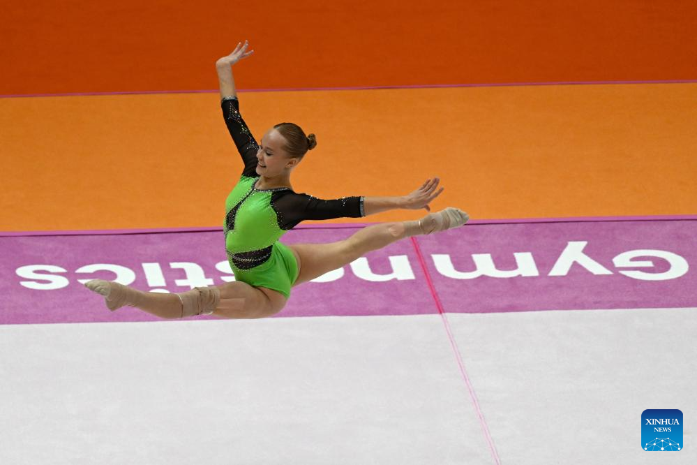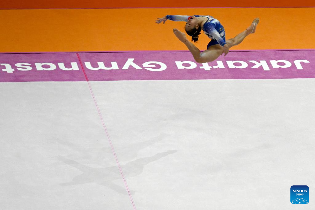 Angelina Melnikova of AIN (Individual Neutral Athlete) competes during the Floor Exercise of the Women's All-Round Final at the 53rd FIG Artistic Gymnastics World Championships in Jakarta, Indonesia, on Oct. 23, 2025. (Xinhua/Agung Kuncahya B.)