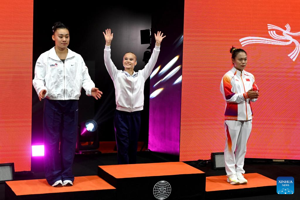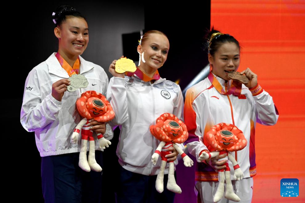 Gold medalist Angelina Melnikova (C) of AIN (Individual Neutral Athlete), silver medalist Leanne Wong (L) of the United States and bronze medalist Zhang Qingying of China attend the awarding ceremony for the Women's All-Round at the 53rd FIG Artistic Gymnastics World Championships in Jakarta, Indonesia, on Oct. 23, 2025. (Xinhua/Agung Kuncahya B.)