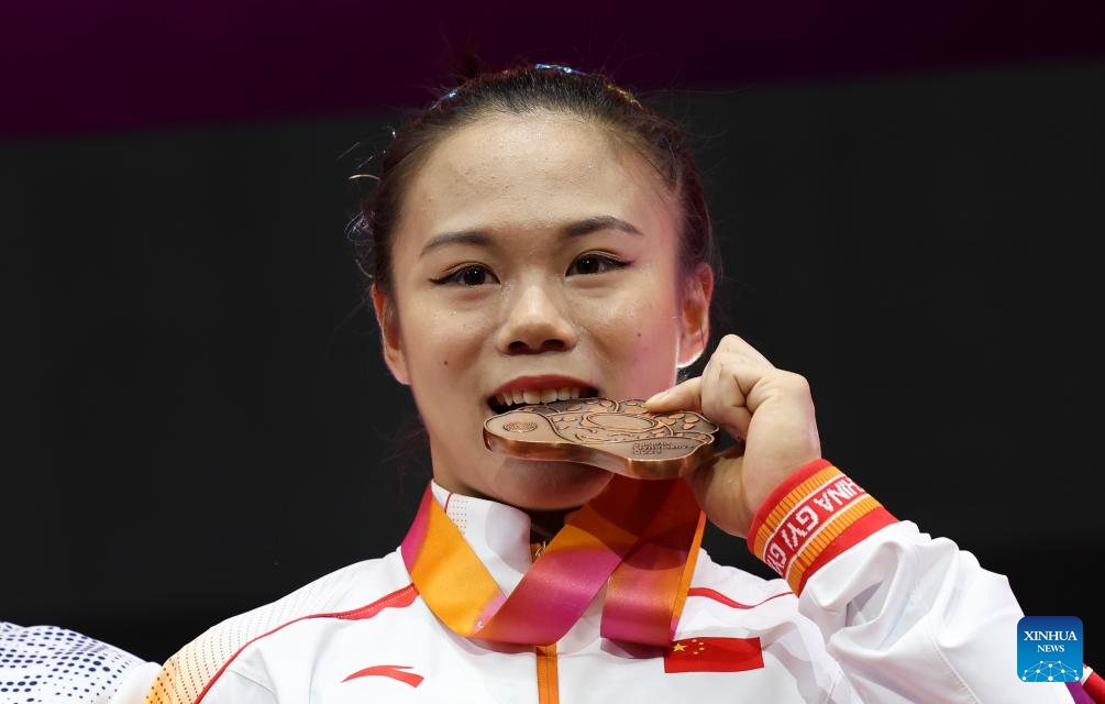 Bronze medalist Zhang Qingying of China poses on the podium during the awarding ceremony for the Women's All-Round Final at the 53rd FIG Artistic Gymnastics World Championships in Jakarta, Indonesia, on Oct. 23, 2025. (Xinhua/Bai Xuefei)